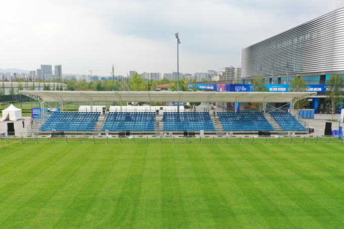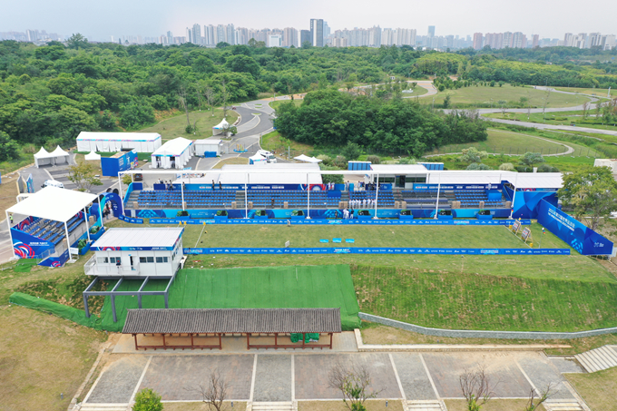 世運(yùn)會(huì)射箭、拔河等比賽觀眾席設(shè)置在成都東安湖體育公園中央廣場、青龍湖濕地公園,超1萬名海內(nèi)外觀眾在這里吶喊歡呼。為支撐世運(yùn)會(huì)觀賽需求,五冶建設(shè)者掛圖作戰(zhàn),倒排工期,全力以赴,攻堅(jiān)克難,在7天之內(nèi)完成了964平方米棚蓋建設(shè),覆蓋1060個(gè)看臺(tái)席位,全部采用裝配式鋼結(jié)構(gòu)施工,最大限度降低對(duì)公園生態(tài)環(huán)境影響,賽后可快速拆除回收利用,做到安全環(huán)保。